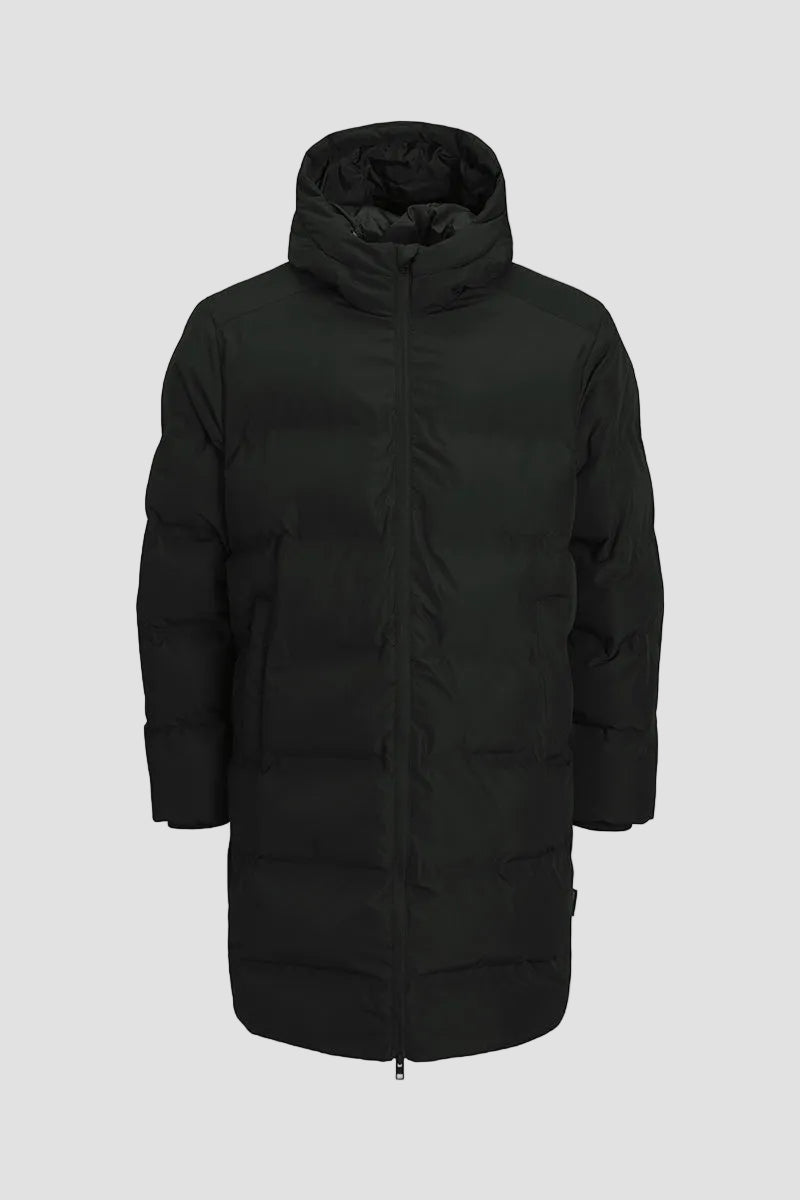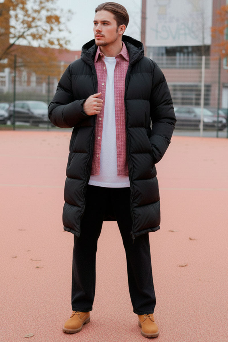 - Długa kurtka puchowa z długim rękawem i kapturem
