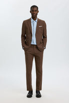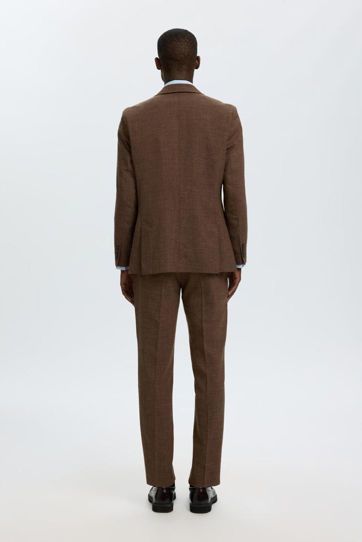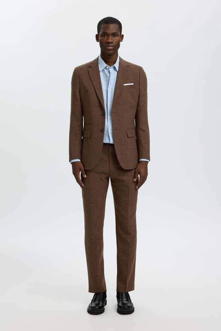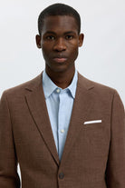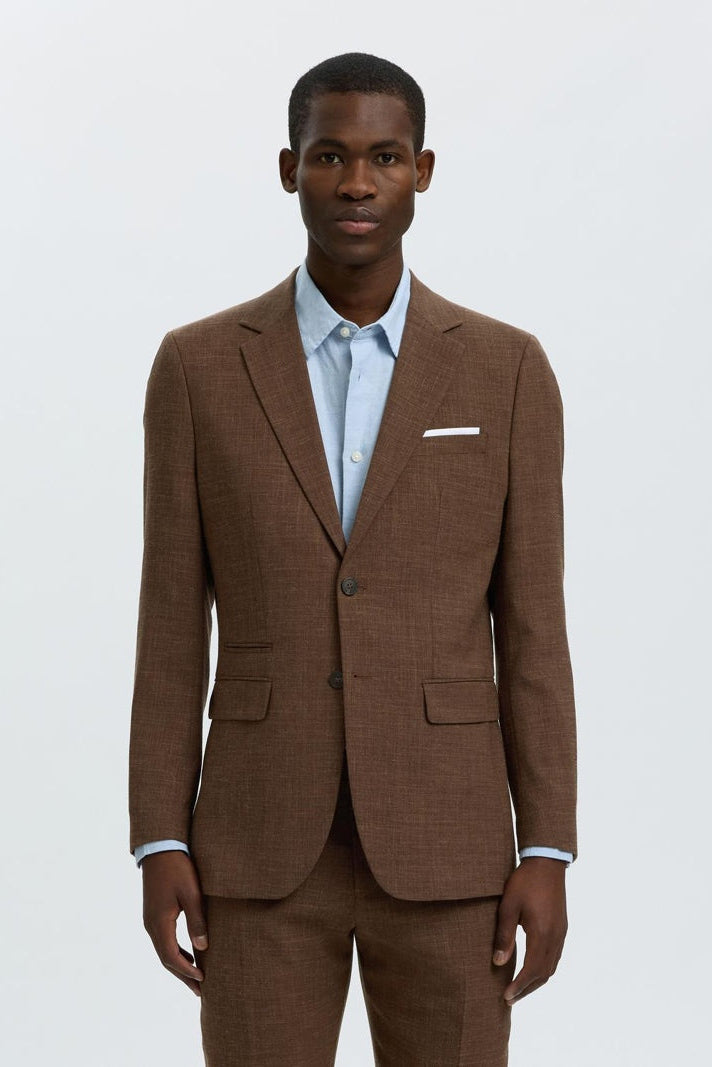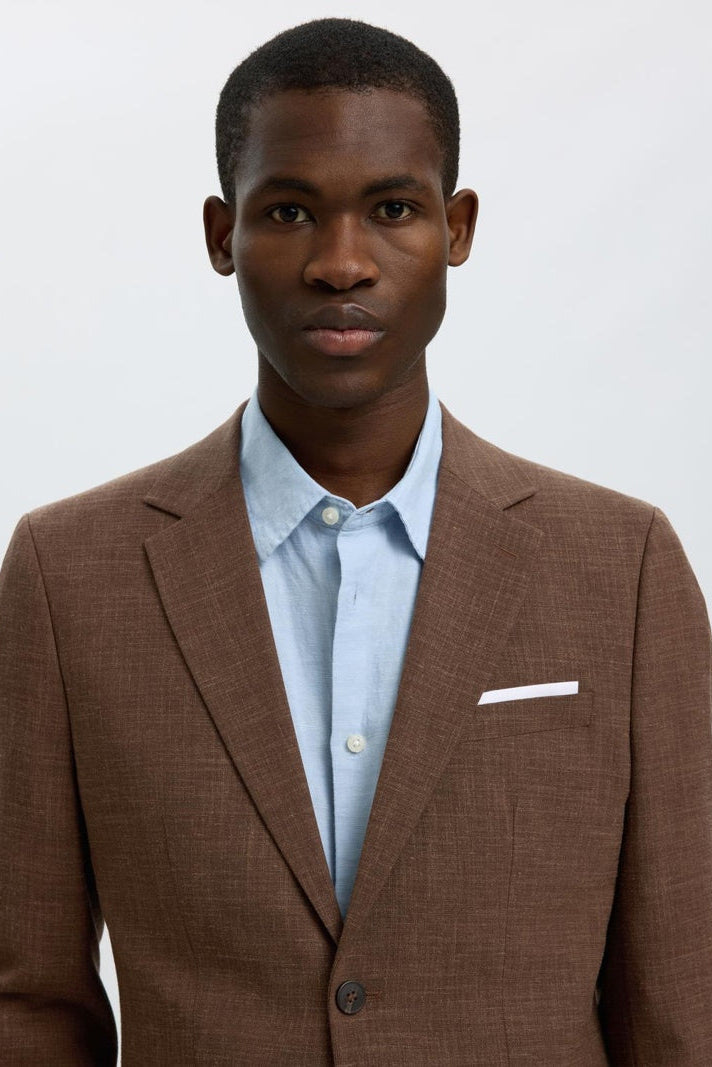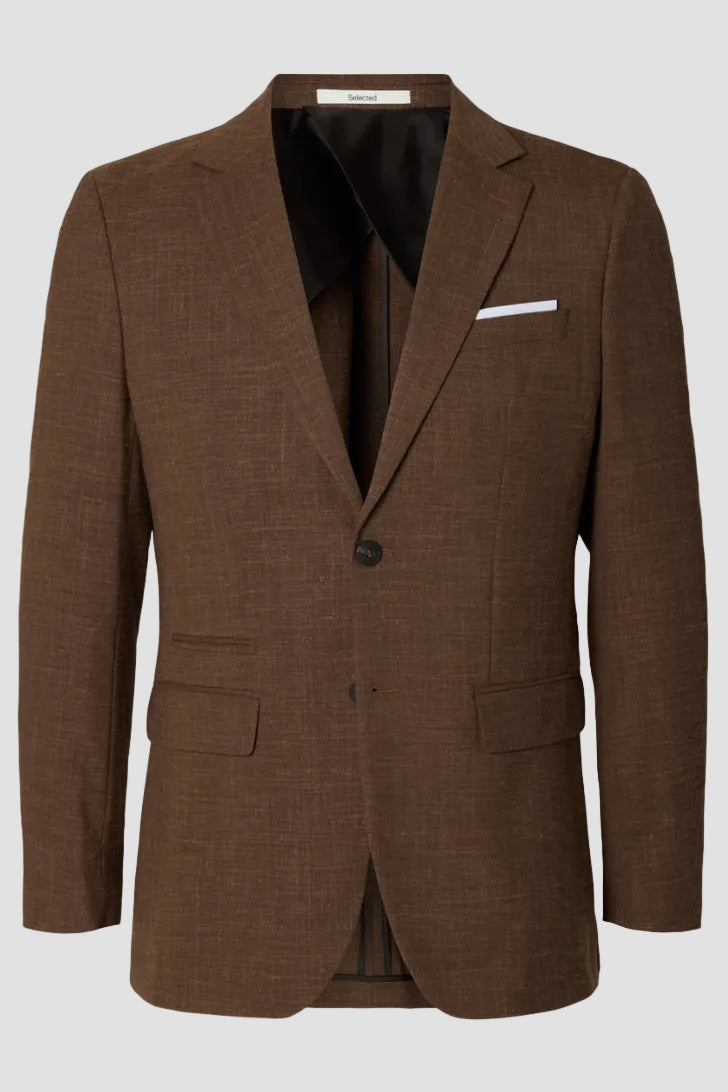 Marynarka o dopasowanym kroju, idealna dla nowoczesnego mężczyzny ceniącego elegancję i skandynawski styl. Utrzymana w ciemnobrązowym odcieniu, wykonana z wysokiej jakości mieszanki poliestru, wełny i lnu, co zapewnia komfort oraz estetyczny wygląd. Klasyczny kołnierz typu notch lapel oraz zapinane na guziki mankiety podkreślają formalny charakter ubrania. Dodatkowo marynarka wyposażona jest w kieszeń na piersi z wysuwaną ozdobną chusteczką oraz guzik na klapce, które nadają jej wyjątkowego charakteru.