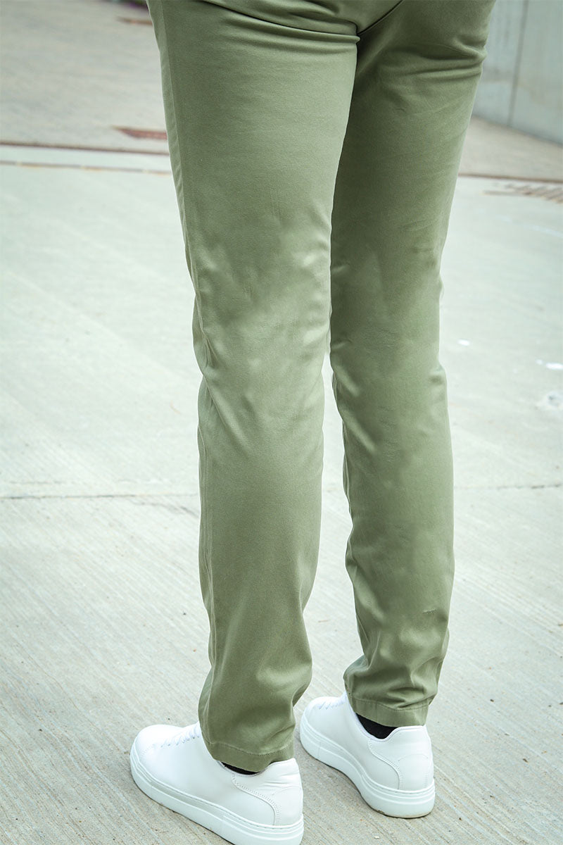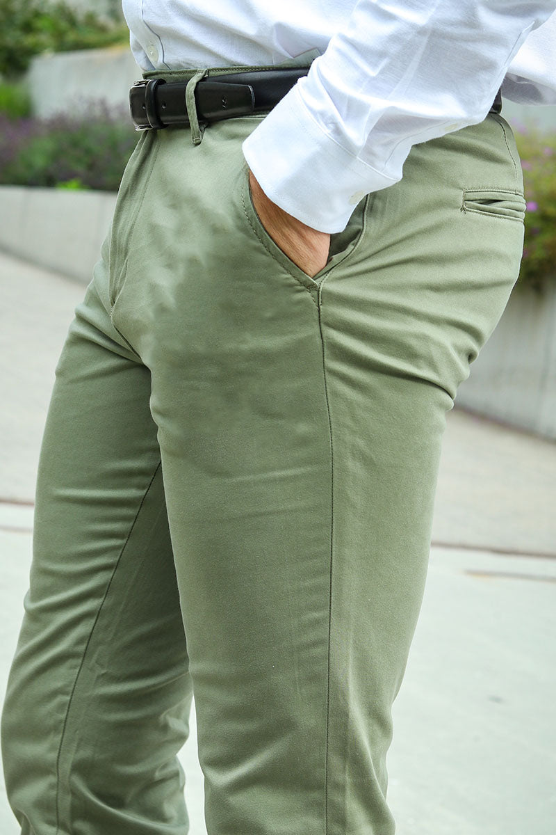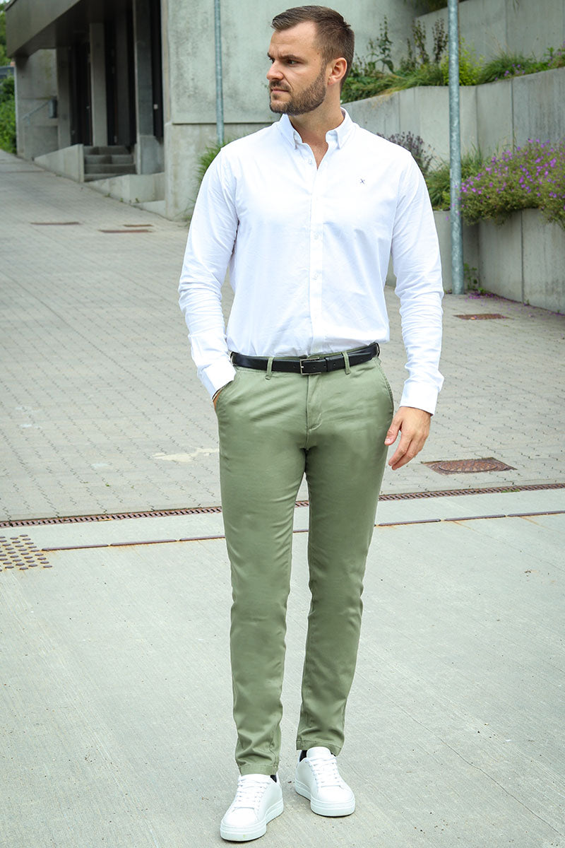 Spodnie chino w kolorze głębokiej zieleni, wykonane z wytrzymałej tkaniny, która nie rozciąga się jak dzianiny. Model o niskim stanie i wąskim kroju, zapewniający nowoczesny i dopasowany wygląd. Zapięcie na zamek oraz praktyczne kieszenie z przodu i z tyłu doskonale łączą funkcjonalność z klasycznym stylem casual. Materiały użyte do produkcji wyróżniają się wysoką jakością i dbałością o środowisko.