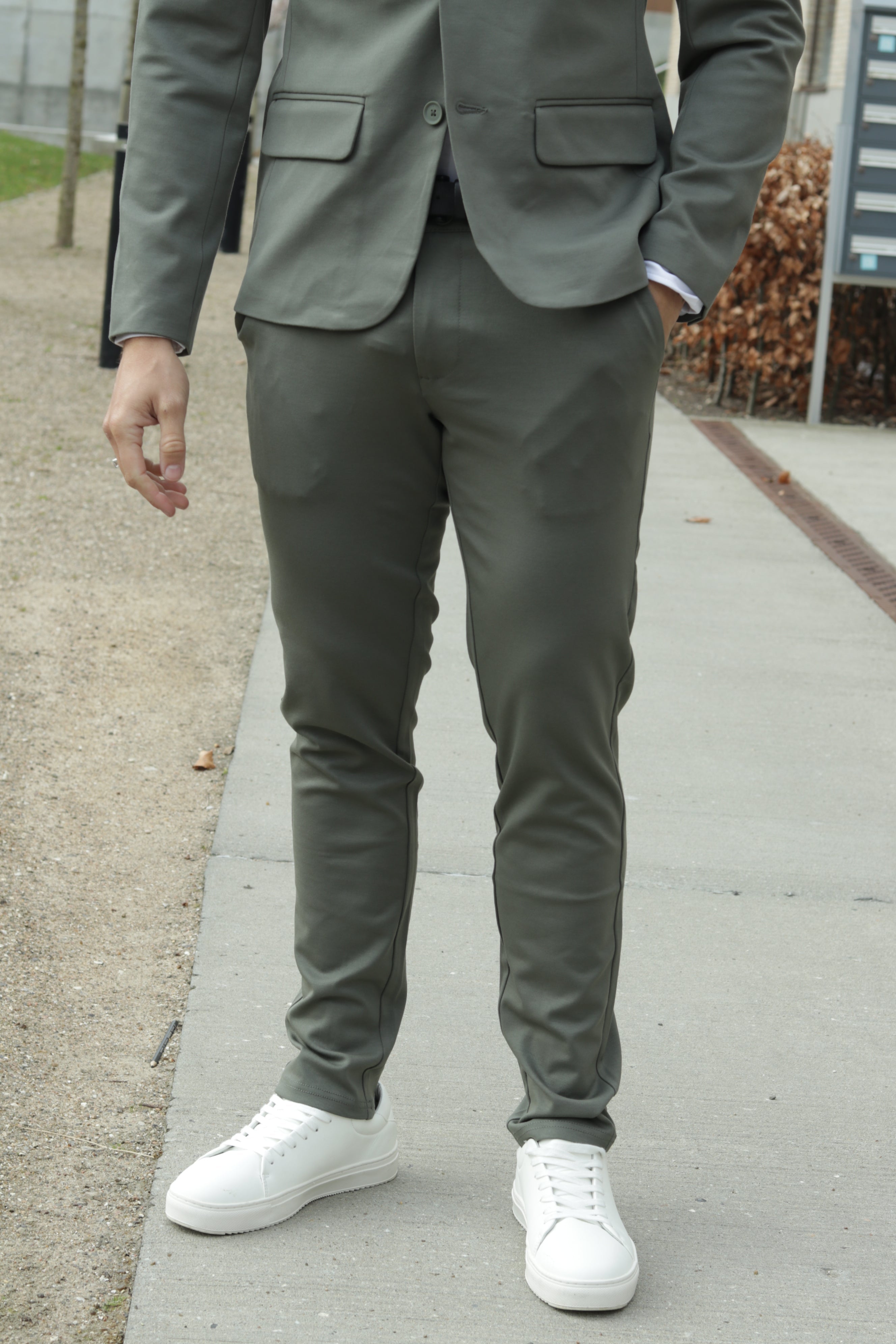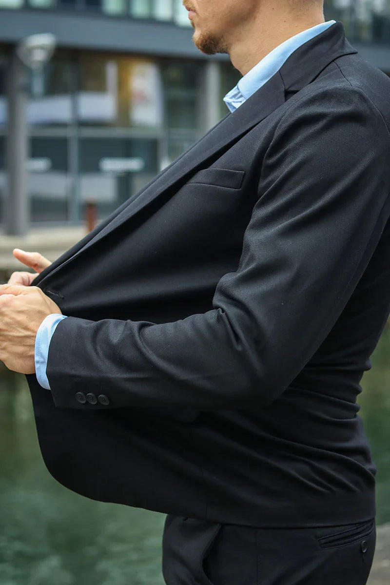 Dopasowanie zależy od tego, jak lubisz nosić swój garnitur i jaką masz budowę ciała. Osoby o szczupłej sylwetce świetnie wyglądają w wąskich garniturach, a osoby o szerokiej sylwetce – w szerokich. Jednak nasze garnitury komfort są zaprojektowane tak, by mogły pasować na każdego bez względu na sylwetkę. Nasz garnitur komfort jest dopasowany do sylwetki, ale dzięki dodatkowemu rozciągnięciu i wygodzie nie będziesz tego odczuwać. Uzyskujesz formalny wygląd dopasowanego garnituru, ale z wygodą, która sprawia, że możesz go nosić przez cały dzień, co dzień, kiedy tylko tego chcesz. Bardzo dobrą wskazówką, która pomoże Ci zdecydować, czy garnitur pasuje, jest zwrócenie uwagi na długość rękawów. Rękaw powinien tak, pasować, żeby około 1 cm pozostało odsłonięte, aby koszula mogła być widoczna pod spodem, dzięki czemu będziesz wyglądać elegancko i formalnie. Jeśli chodzi o spodnie, to również można je dopasować do swoich upodobań. Krótsza długość w połączeniu z loafersami cieszy się coraz większą popularnością, ale oczywiście możesz też wybrać klasyczne buty wizytowe i spodnie o normalnej długości. Możliwości są niezliczone.