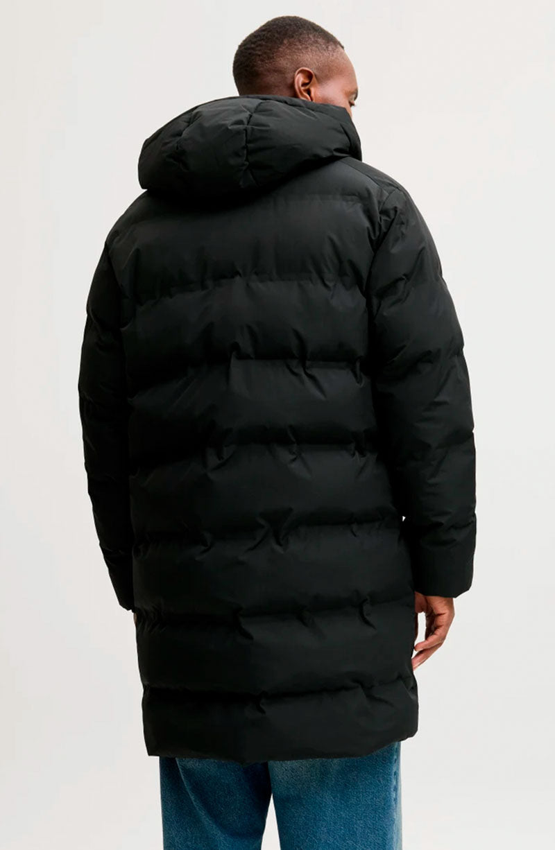 - Długa kurtka puchowa z długim rękawem i kapturem