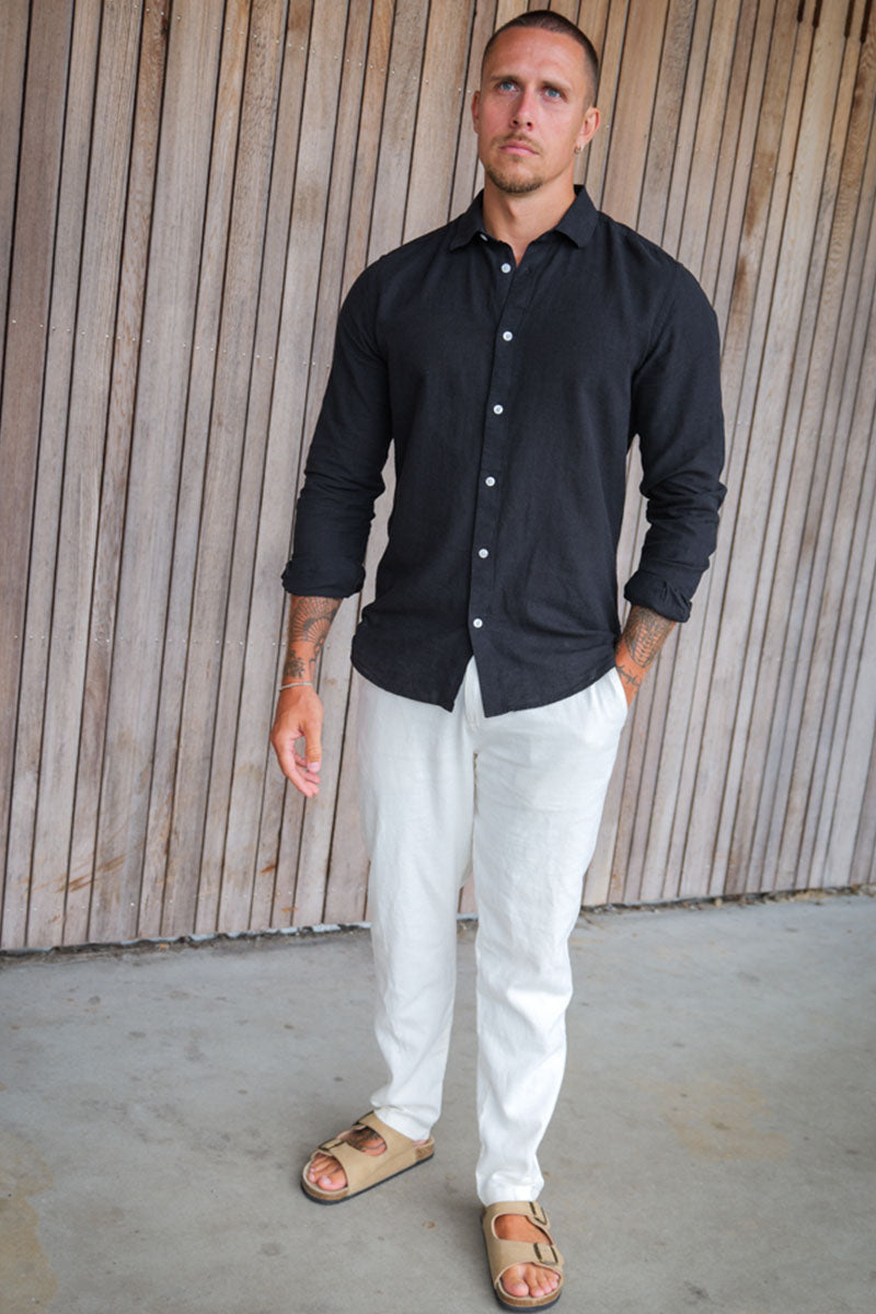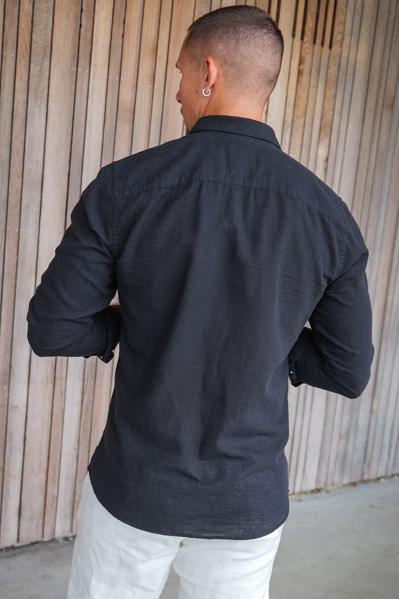 Ta koszula męska o dopasowanym kroju doskonale łączy naturalną przewiewność lnu z komfortem bawełny i ekologiczną wartością bawełny z recyklingu. Dzięki długim rękawom i klasycznemu kołnierzykowi koszula sprawdzi się zarówno na co dzień, jak i na bardziej formalne okazje. Czarny kolor podkreśla ponadczasowy charakter ubrania, a starannie dobrane materiały zapewniają trwałość i wygodę użytkowania.