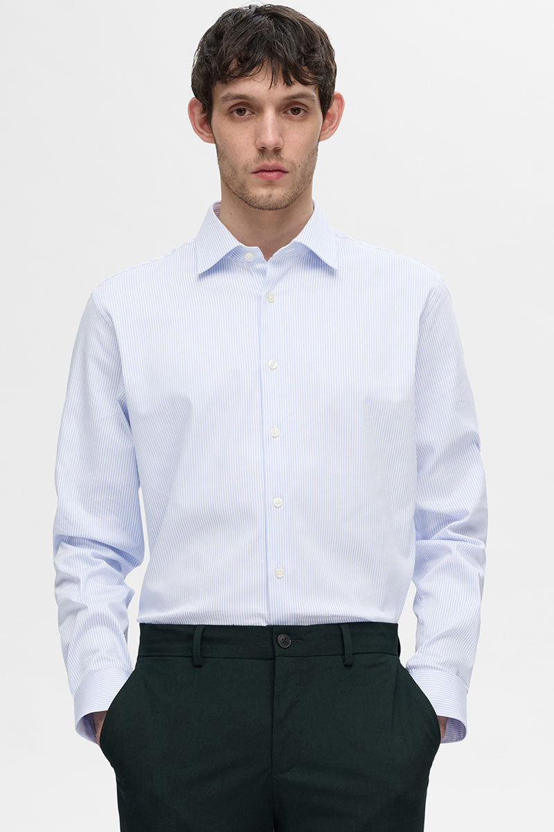 - Pasiasta koszula z klasycznym kołnierzykiem, zaokrąglonym dołem i długimi rękawami z mankietami zapinanymi na guziki