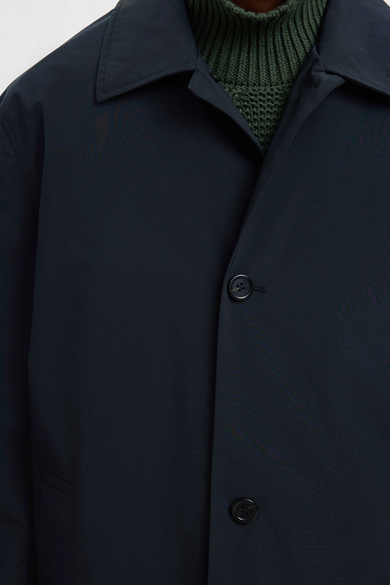 - Tech‑płaszcz zapinany na jeden rząd guzików, regular fit, wodoodporny, wiatroszczelny i oddychający