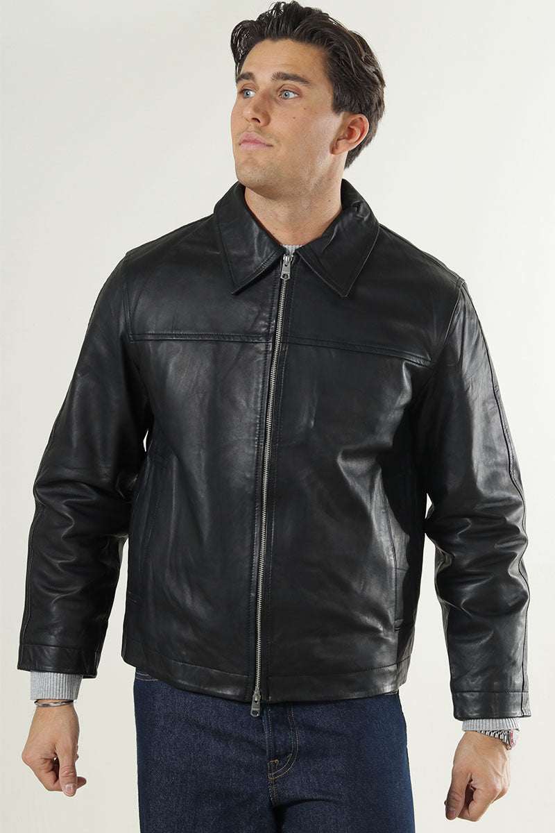 Skórzana kurtka typu blouson uszyta z naturalnej skóry jagnięcej, która zapewnia miękkość i trwałość. Model w klasycznym czarnym kolorze wyposażono w rozłożysty kołnierz oraz długi rękaw, które podkreślają ponadczasowy styl. Zapięcie na dwukierunkowy zamek błyskawiczny ułatwia regulację komfortu noszenia, a praktyczne kieszenie po bokach i wewnętrzna kieszeń pozwalają na bezpieczne przechowywanie drobiazgów. Wnętrze wyłożono delikatną podszewką z poliestru, która gwarantuje wygodę i komfort przez cały dzień.