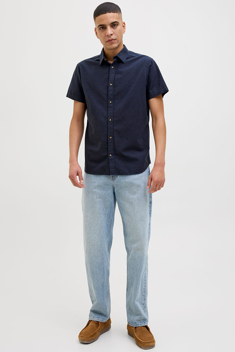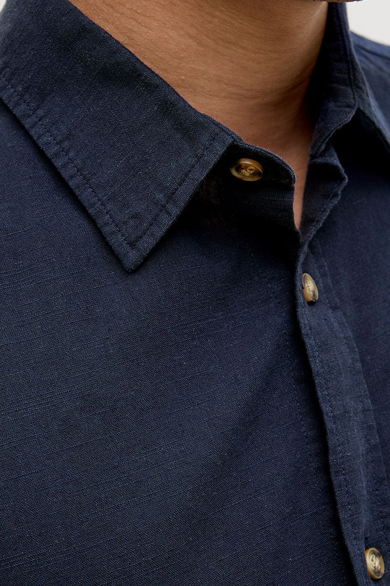 - Koszula lniana z krótkim rękawem i klasycznym kołnierzykiem.