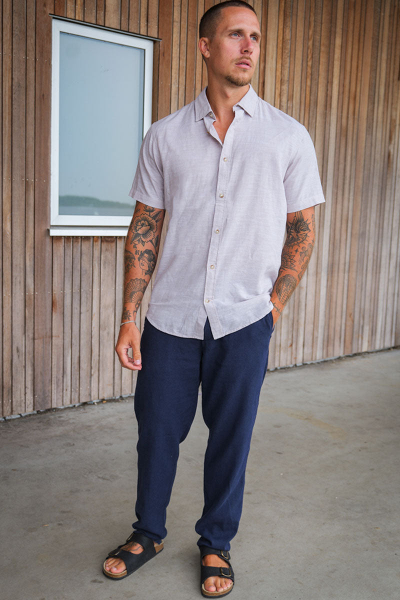 - Koszula lniana z krótkim rękawem i klasycznym kołnierzykiem.