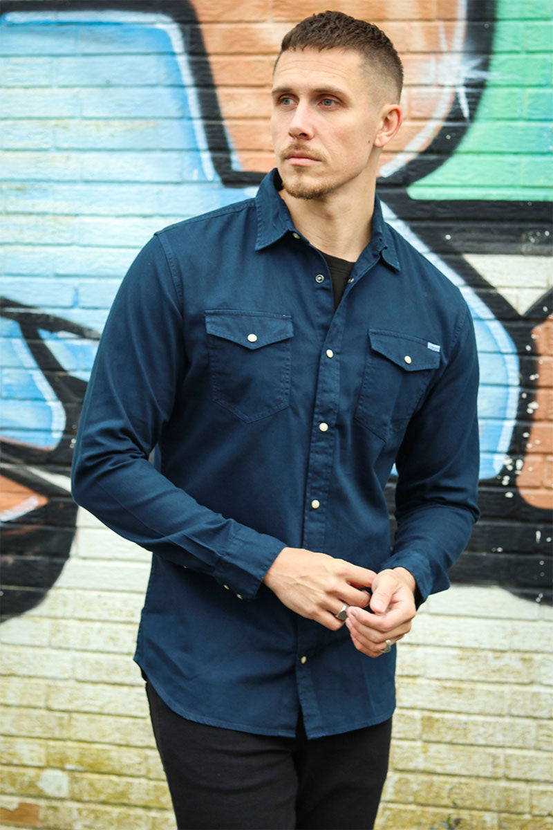 Koszula Sheridan o klasycznym kroju z długim rękawem i kołnierzykiem typu shirt collar, zapinana na guziki. Wykonana w 100% z bawełny organicznej, co zapewnia komfort i naturalność noszenia. Charakteryzuje się regularnym dopasowaniem, a jej ciemnogranatowy kolor nadaje jej elegancki, ale zarazem codzienny charakter.