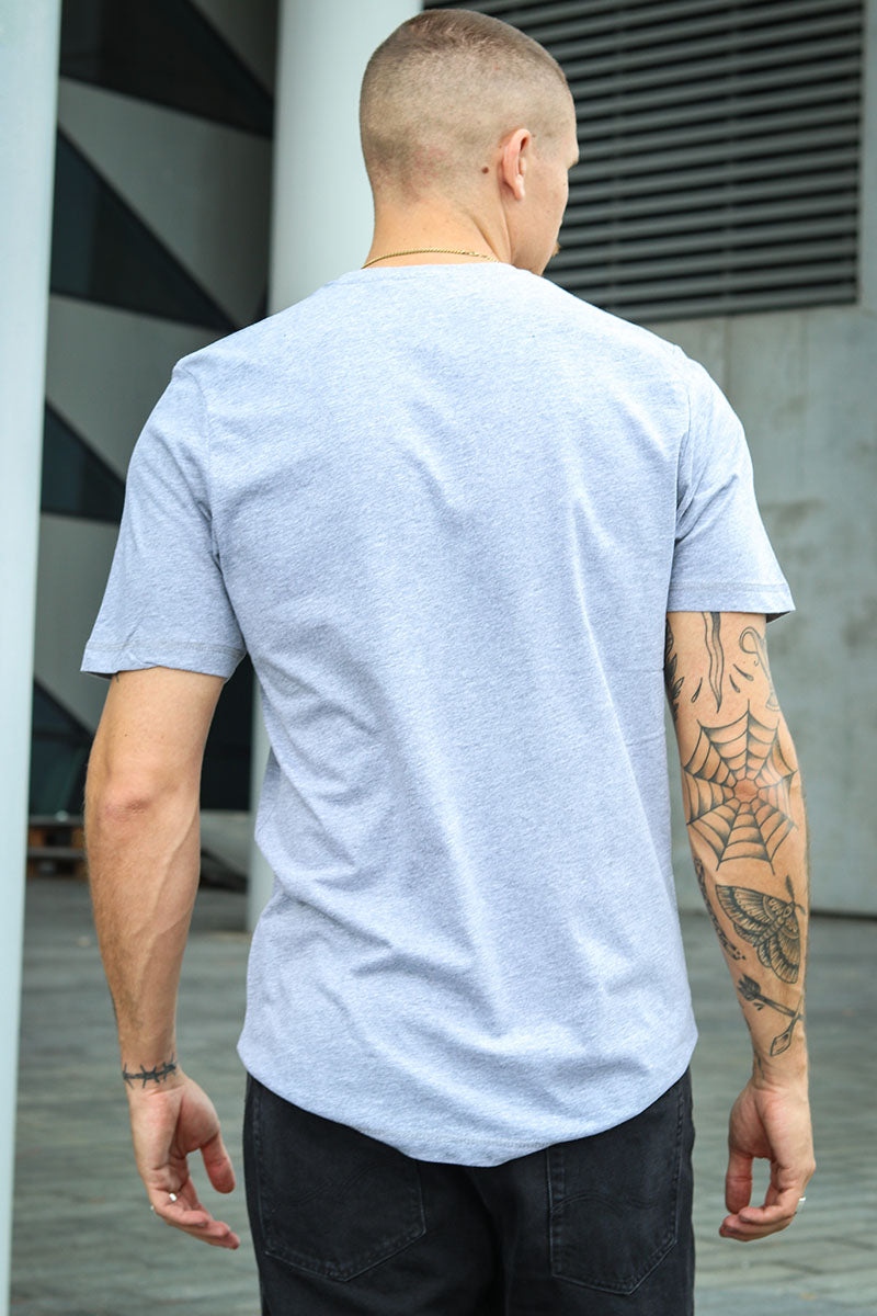 Materiał: Koszulka wykonana jest w 85% z czesanej bawełny i 15% wiskozy, co daje miękki i lekko melanżowy efekt. Dzianina typu single jersey zapewnia gładką i jednolitą powierzchnię, która wygląda dobrze nawet po wielu praniach.