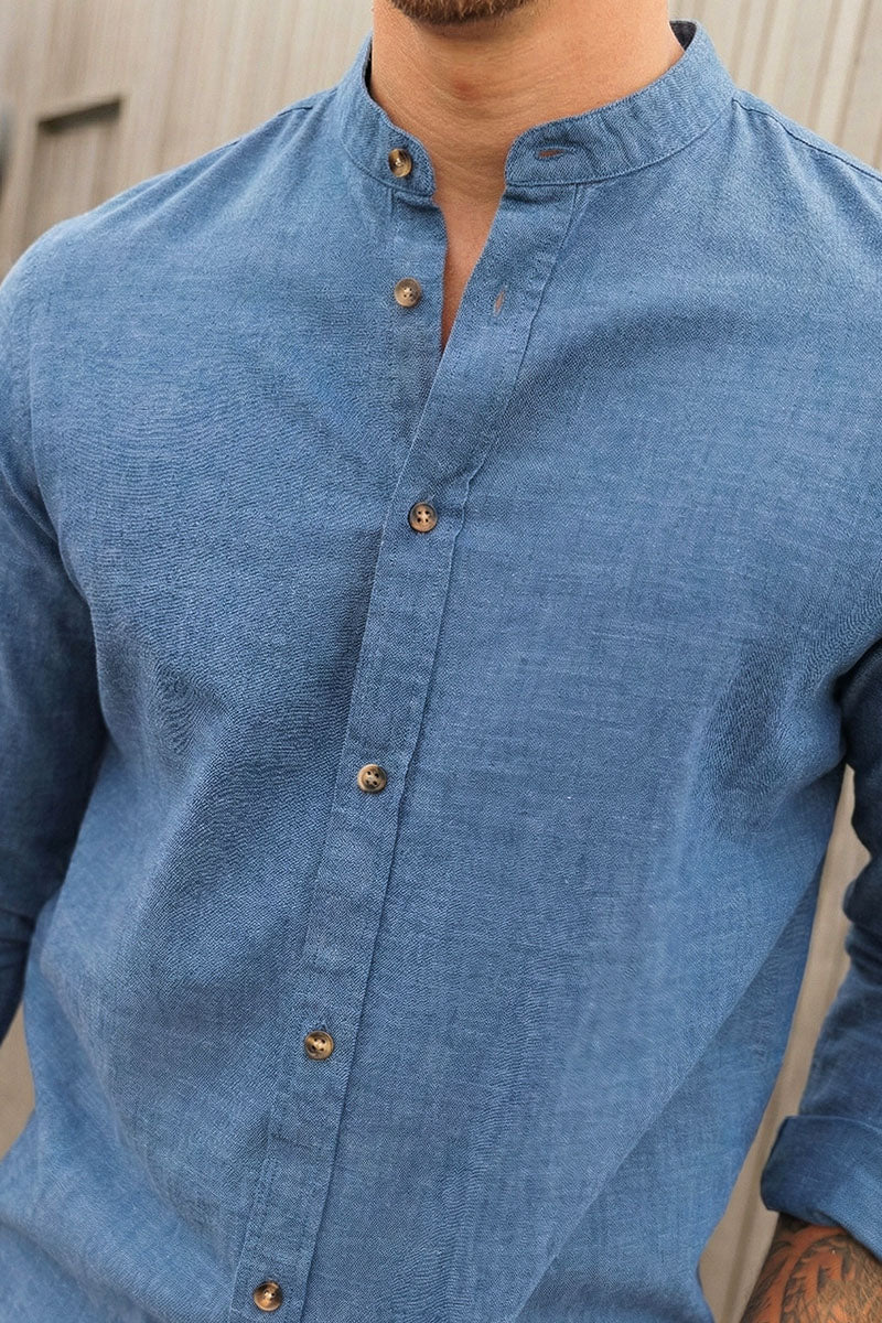 Koszula wykonana z mieszanki lnu oraz bawełny organicznej, która zapewnia lekkość i przewiewność idealną na letnie dni. Tkanina o strukturze tkanego materiału jest mocna i trwała, a jednocześnie nie rozciąga się jak dzianiny. Koszula ma długi rękaw oraz kołnierzyk typu banded collar, co nadaje jej elegancki i nowoczesny wygląd. Regularny krój gwarantuje komfort noszenia.