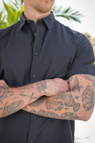 • Koszula lniana z krótkim rękawem, klasycznym kołnierzykiem i zaokrąglonym brzegiem