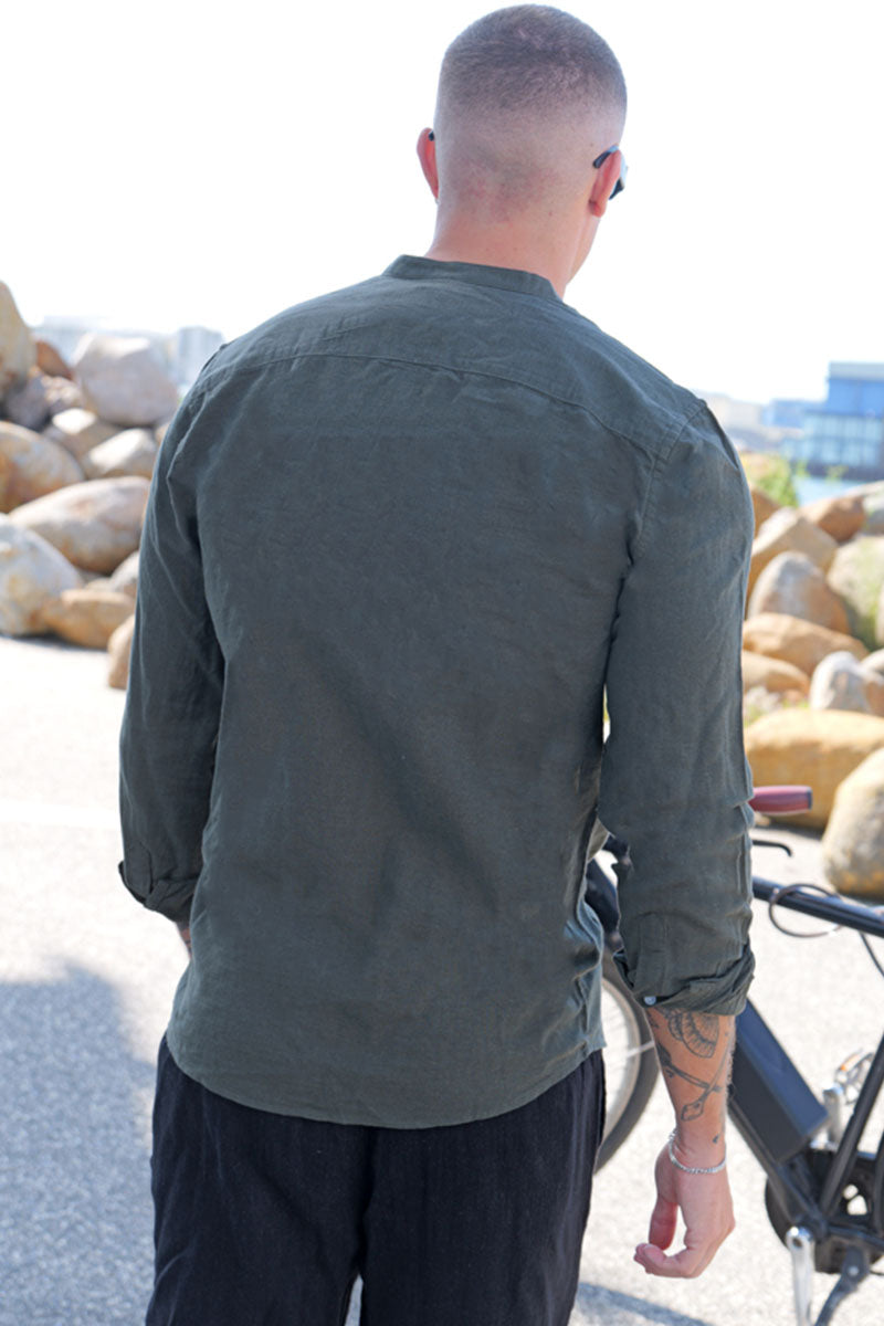 - Wyposażona w kołnierzyk mandaryński i klasyczne zapięcie na guziki.