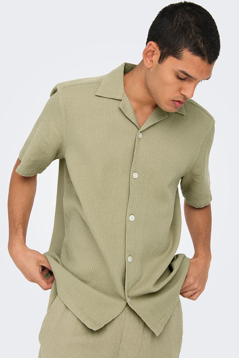 - Beżowa koszula z krótkim rękawem o regularnym kroju