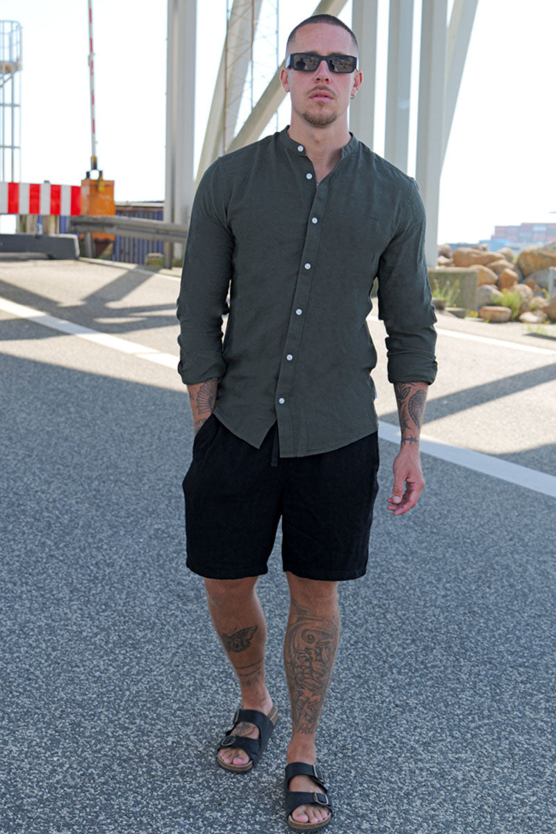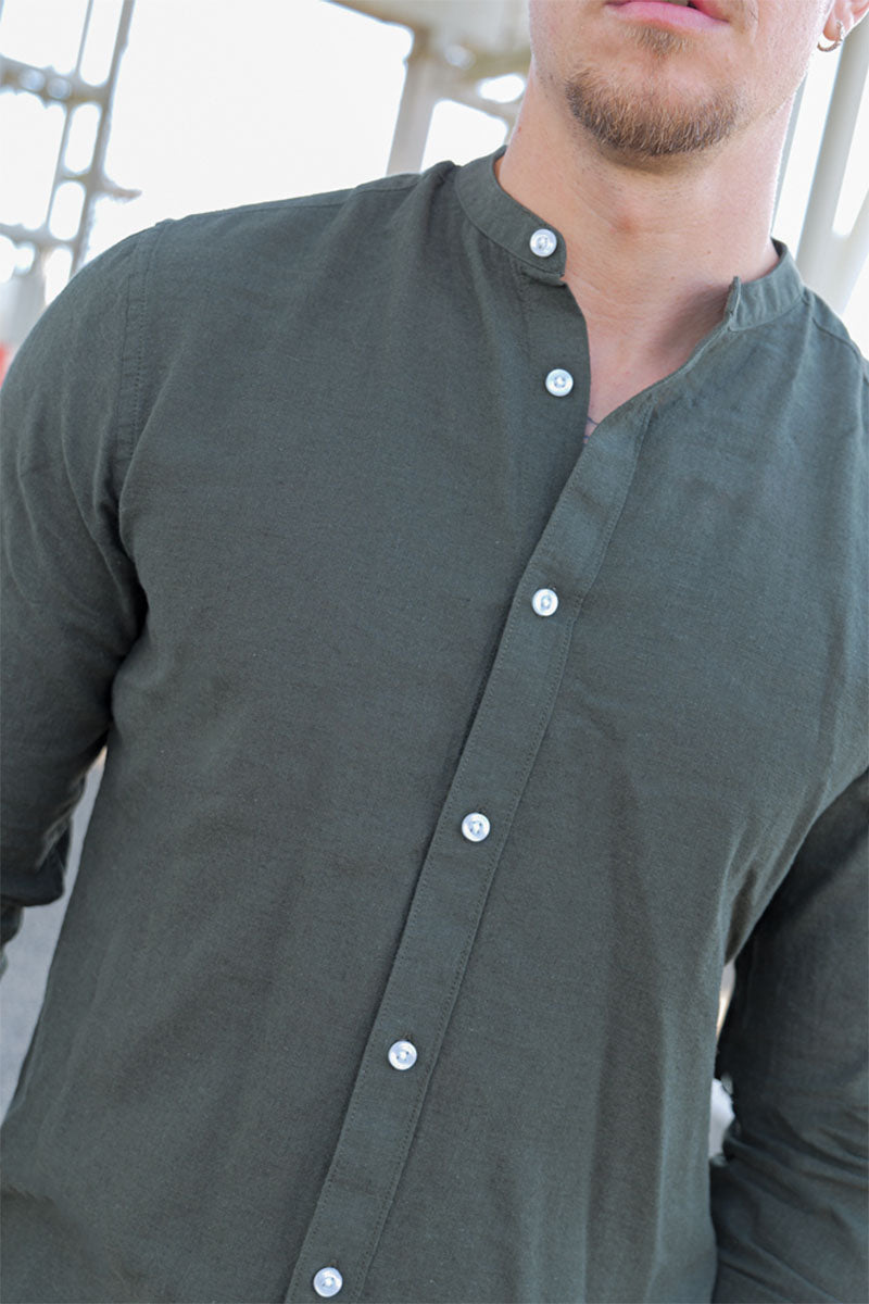 - Wyposażona w kołnierzyk mandaryński i klasyczne zapięcie na guziki.