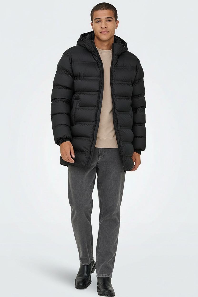 - Długa kurtka puchowa z wysokim kołnierzem