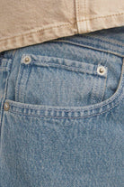 Jeansy o luźnym kroju typu baggy z wysokim stanem, wykonane z trwałej tkaniny denim, która została poddana stonewashowi, nadającym im wyblakły i zużyty wygląd. Projekt cechuje się klasycznym układem pięciu kieszeni, który jest ponadczasowy i prosty, idealny na co dzień.