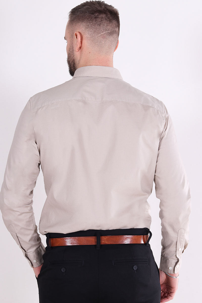 - Beżowa koszula z długim rękawem w kroju slim fit