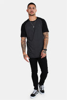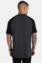Short Sleeved T-shirt from Basic in gray anthracite with black sleeves. The neckline is round with a black ribbing. Good fit and has a ribbed bottom. The quality is 65% cotton and 35% polyester. THE MODEL IS APPROX. 1,83 CM AND 80 KG HE WEARS THIS PRODUCT IN A SIZE M