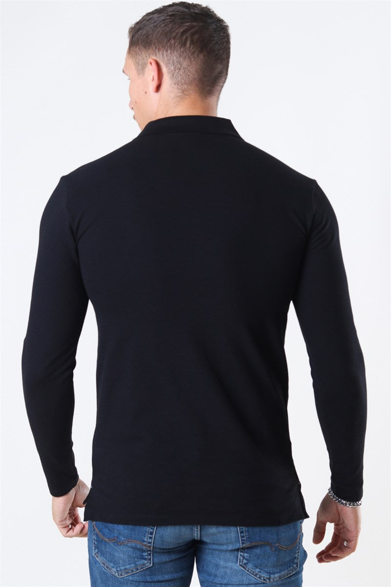 Muscle fit Polo LS w kolorze Black to koszulka polo z długim rękawem, która jest idealna na formalne okazje lub zwykły dzień. Dodaje wyrafinowania i elegancji i jest idealna zarówno do pracy, jak i na imprezy. Klasyczny krój polo z długimi rękawami zapewnia ponadczasowy wygląd, który pasuje do każdego stroju. -