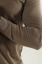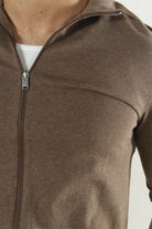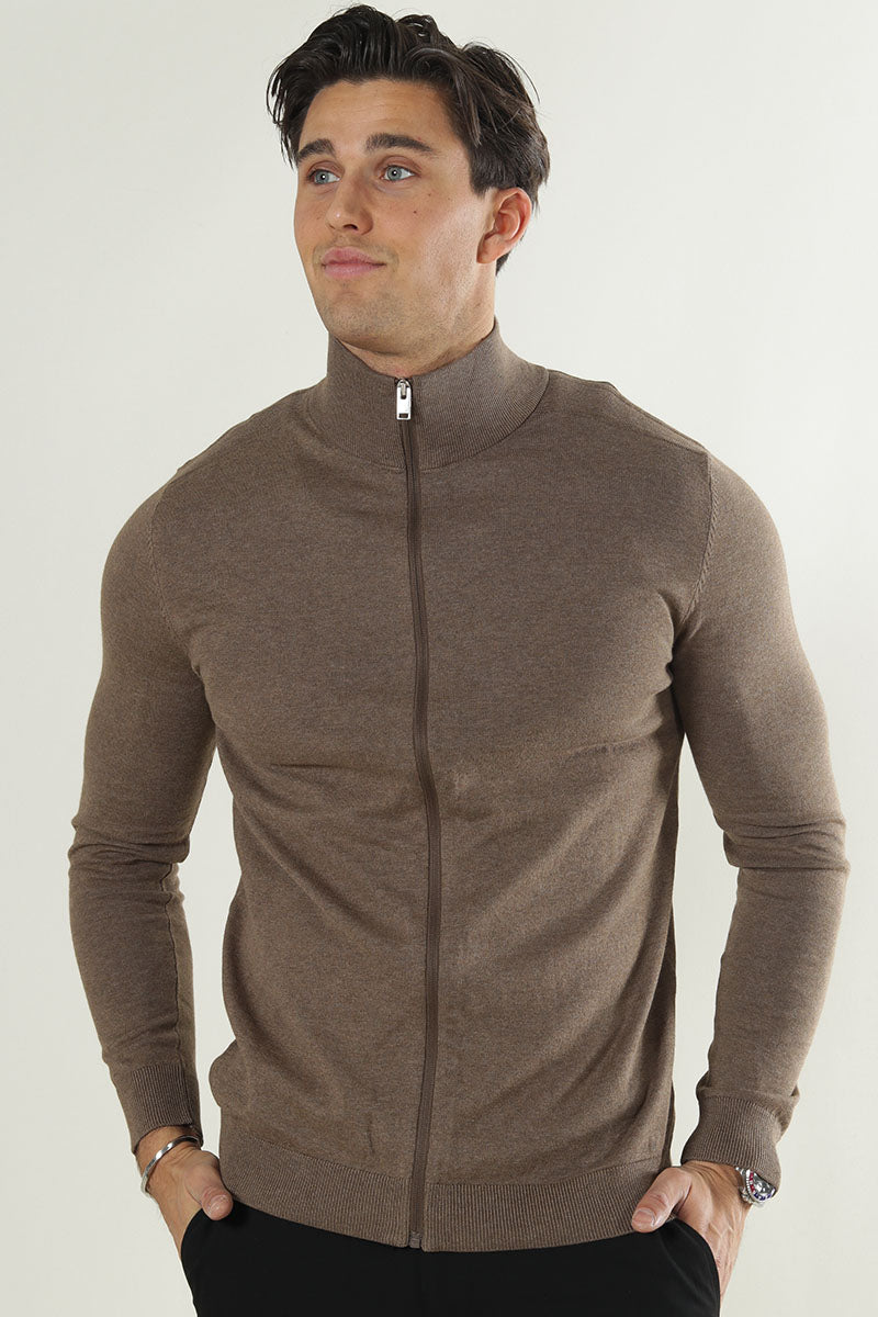 Kardigan z pełnym zamkiem błyskawicznym to ponadczasowy i wygodny wybór do codziennej garderoby. Charakteryzuje się wysokim kołnierzem, długimi rękawami oraz ściągaczowymi mankietami, które zapewniają dobry komfort noszenia. Krój regularny dobrze dopasowuje się do sylwetki, oferując swobodę ruchów. Kolor teak z delikatnym efektem melanżu nadaje ubraniu subtelny, naturalny wygląd.