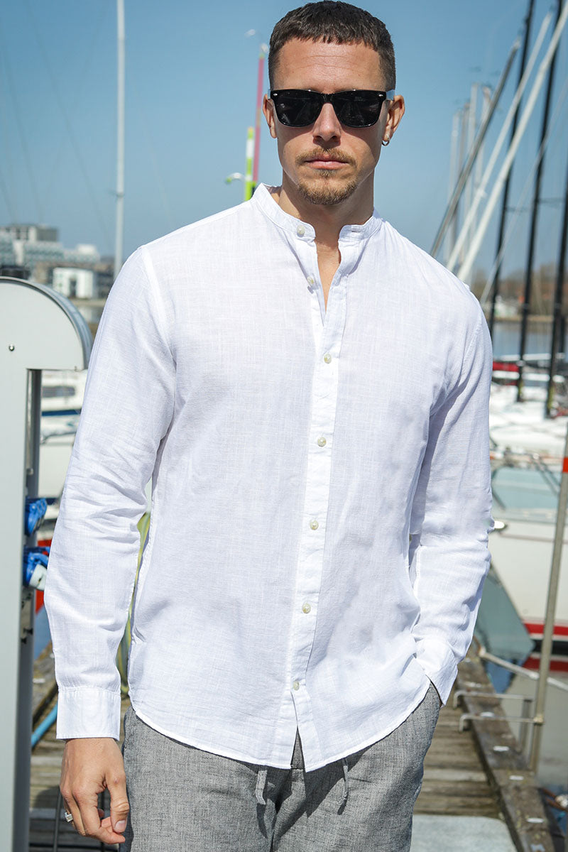 - Koszula lniana z długim rękawem i kołnierzykiem typu mandarynka.