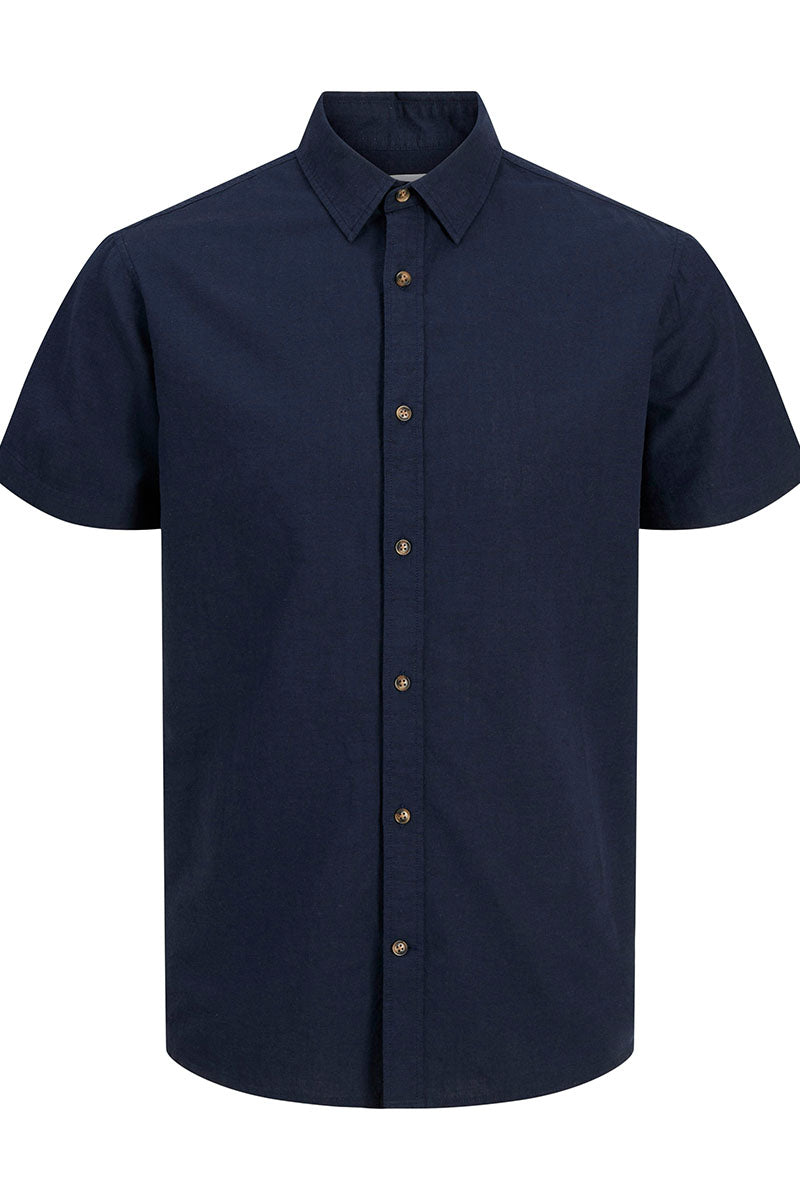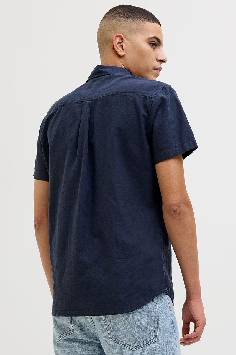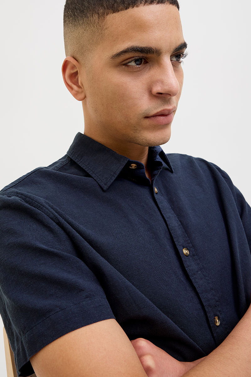 - Koszula lniana z krótkim rękawem i klasycznym kołnierzykiem.