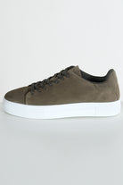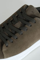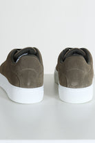 • Brązowy zamszowy but z grubą białą gumową podeszwą