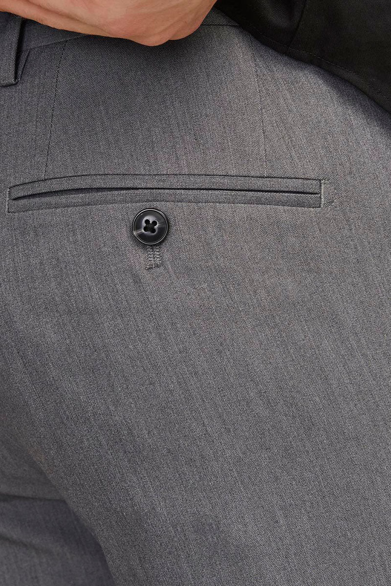 Spodnie z efektem super slim fit w kolorze jasnoszarym melanżowym, które podkreślają nowoczesny i dopasowany styl. Wykonane z wysokiej jakości materiałów, łączących 78% poliestru z recyklingu, 17% wiskozy oraz 5% elastanu, co zapewnia komfort oraz trwałość noszenia. Idealne na formalne okazje, gdzie liczy się zarówno wygoda, jak i elegancki wygląd.