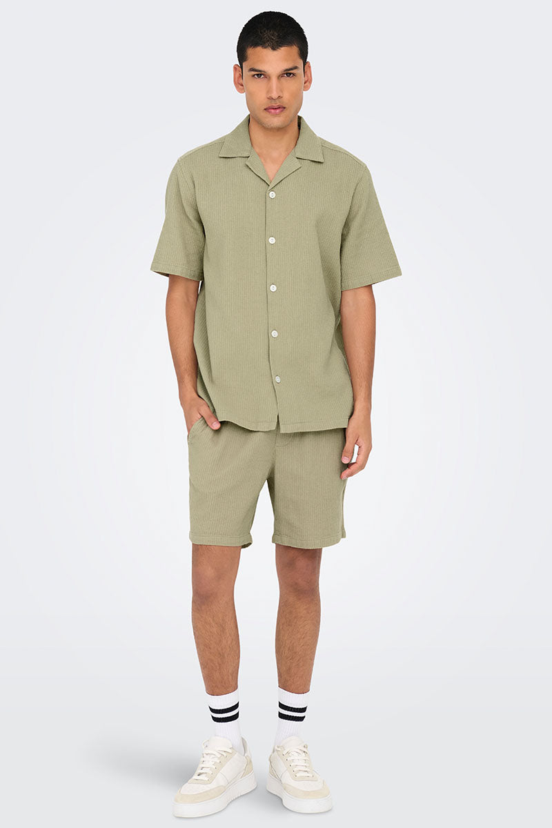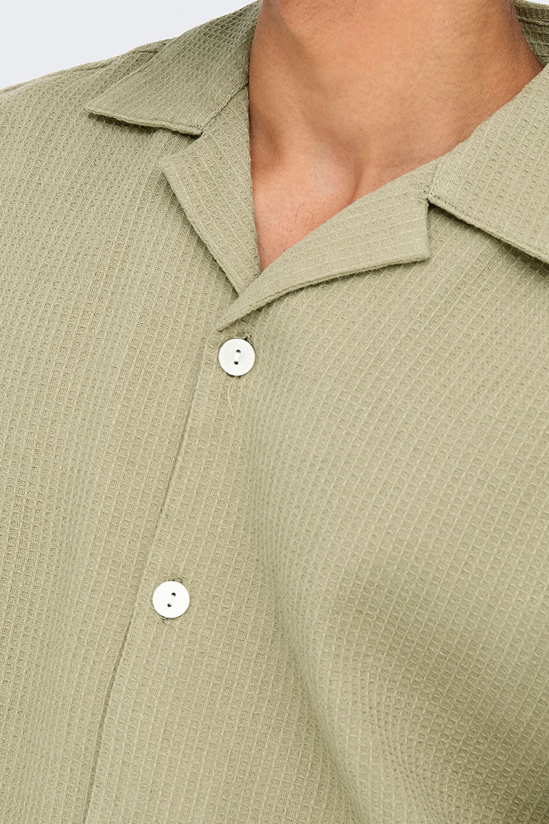 - Beżowa koszula z krótkim rękawem o regularnym kroju