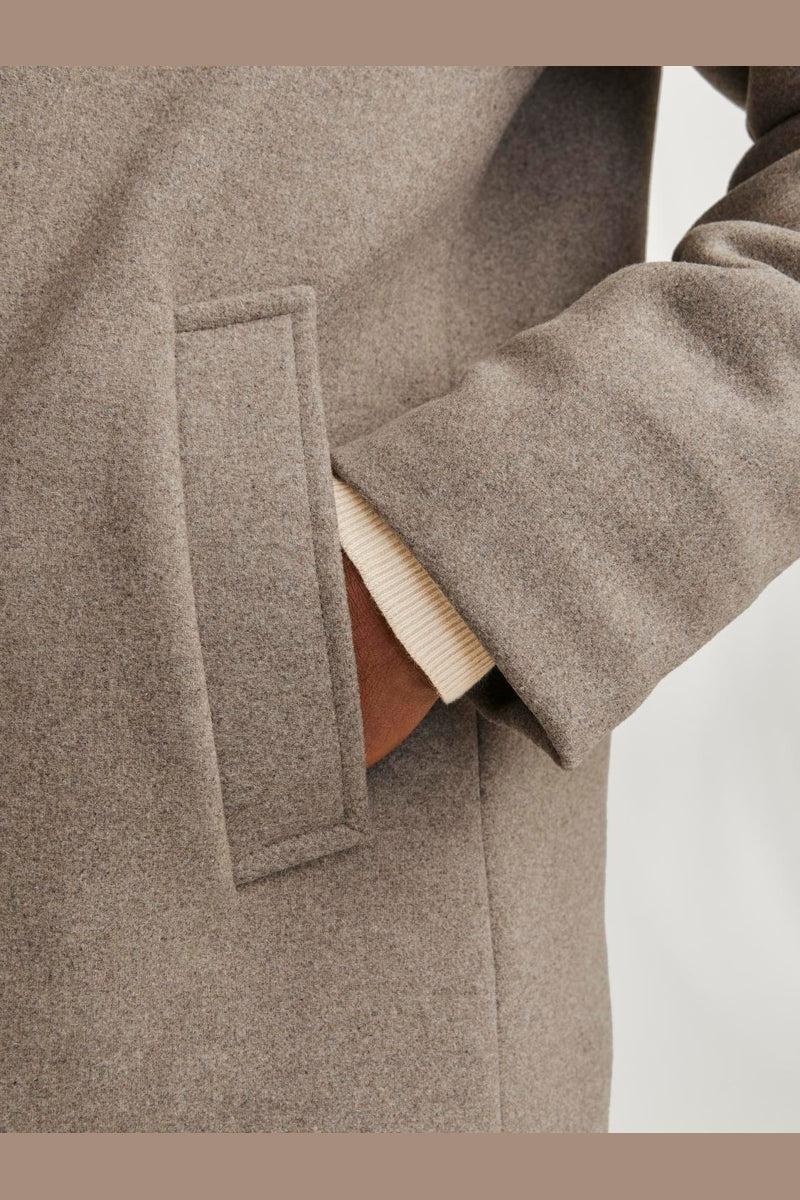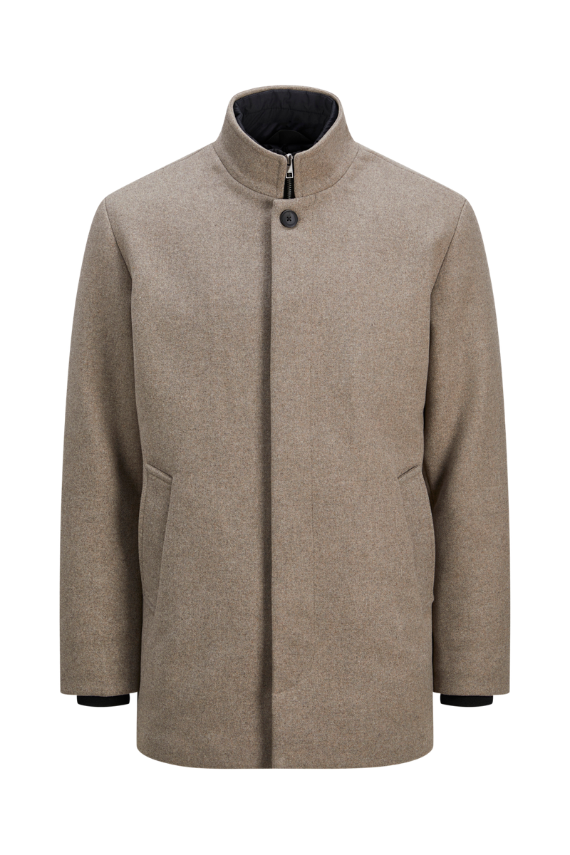 • Beżowa wełniana kurtka z pionowymi kieszeniami po bokach.