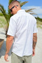 - Koszula lniana z krótkim rękawem i klasycznym kołnierzykiem.
