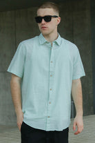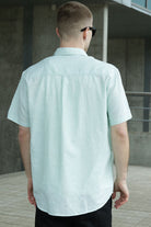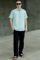 - Koszula lniana z krótkim rękawem i klasycznym kołnierzykiem.