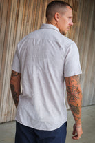 - Koszula lniana z krótkim rękawem i klasycznym kołnierzykiem.