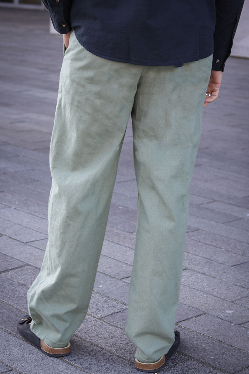 - Zielone lniane spodnie w luźnym kroju