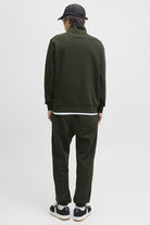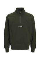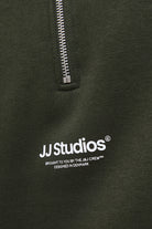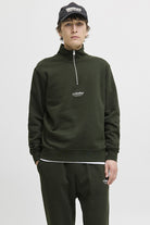 - Bluza z half‑zip w relaxed fit, z długimi rękawami i małym nadrukiem na piersi