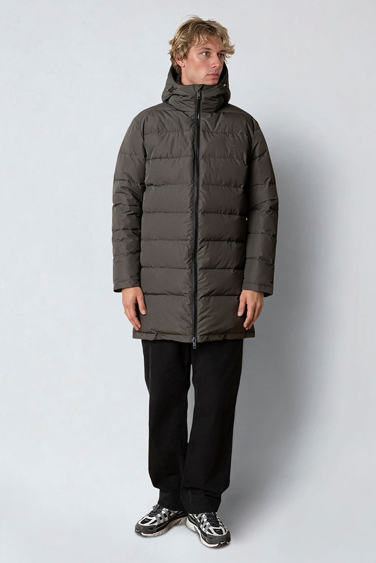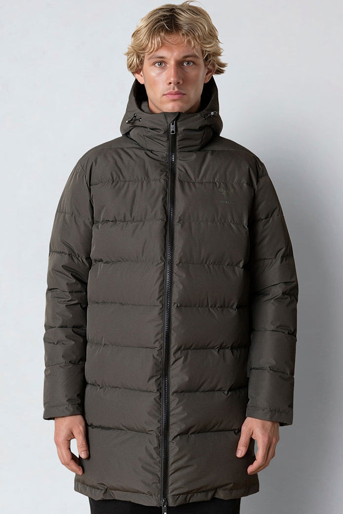 • Długa kurtka puchowa z wysokim kołnierzem i kapturem