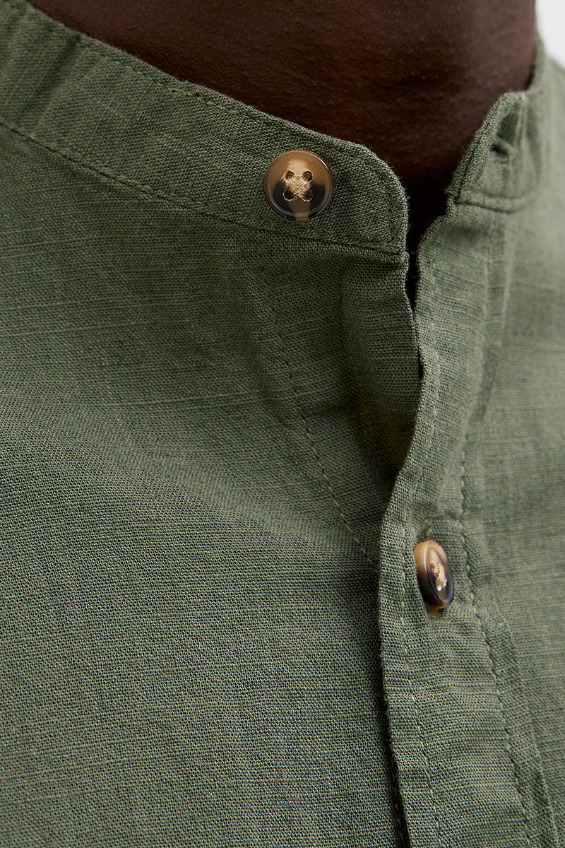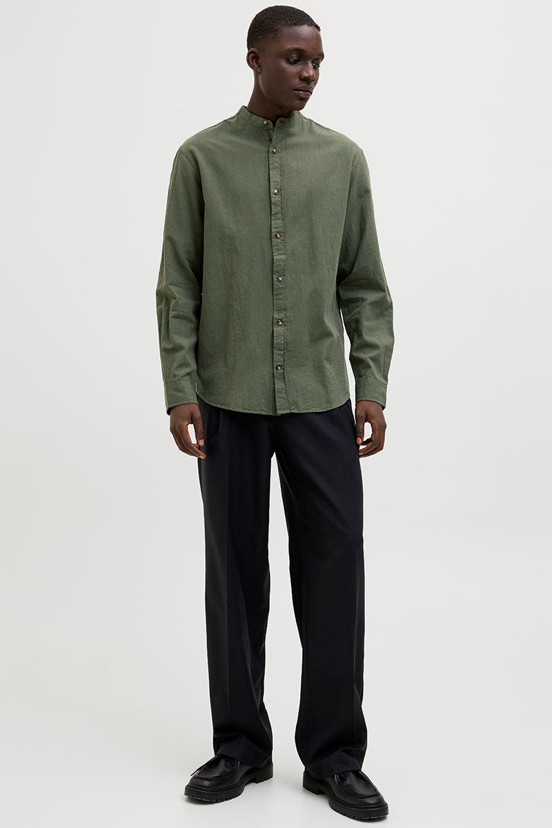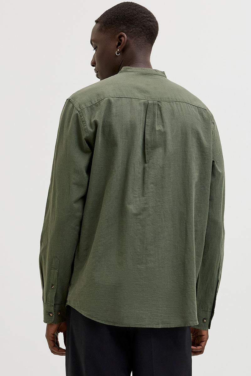 - Ciemnozielona lniana koszula z długim rękawem, krój comfort fit