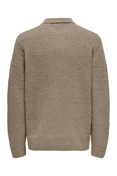 - Sweter posiada dziany kołnierz i 3 guziki u góry. Dodatkowo ma ściągacze u dołu i na rękawach