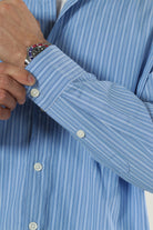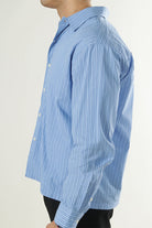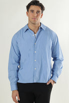 Koszula w luźnym kroju wykonana z lekkiego popeliny, tkaniny o subtelnym połysku i gładkiej powierzchni. Posiada długi rękaw zakończony regulowanymi mankietami na guziki oraz klasyczny kołnierzyk. Zapinana na guziki, doskonała na co dzień, do pracy oraz na specjalne okazje. Dzięki uniwersalnemu wzorowi w paski w kolorze skyway łatwo dopasowuje się do różnych stylizacji.
